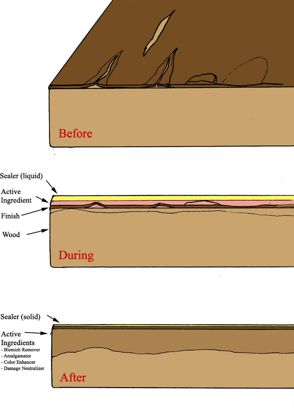 While the surface is being cleaned, the finish is being rejuvenated. As well, damage to the finish caused by dehydration and excess moisture is being repaired through reamalgamation of the finish to the wood surface. Problems solved through this process include removal of white water rings, white hazing, scratches, cracks in the finish, finish separation from the wood, and, Wood Elixir reverses dry-finish flaking.