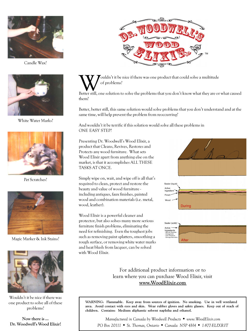 In this example, old varnish is separating from dried-out furniture, and the finish will flake off if rubbed too hard. Apply Dr. Woodwell's Wood Elixir with a brush, wait a few minutes, then wipe lightly with a clean cloth. The original finish will be reattached and strengthened, and will cure in 24 hours. Dr. Woodwell's Wood Elixir will help reestablish the original color and gloss.